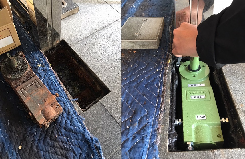 店舗や会社、マンションエントランスなどで使用されているフロアヒンジ。床に埋まっているので普段は存在していることすら認識されていない縁の下の力持ちです。