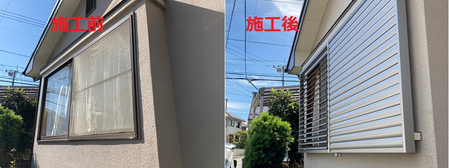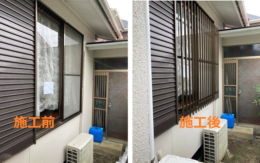 防犯目的や災害から窓ガラスを守る為にニーズの高まる面格子と可動式ルーバーの施工写真です。もちろん当社社員が取付け対応します。他社(外部職人)に委託する事がありませんので、中間手数料もかからずお安く施工可能です。