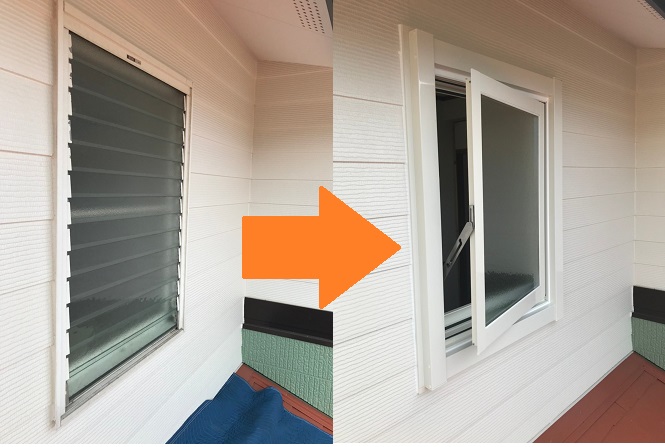 施設や住宅の窓交換工事を承っております。最近ではルーバー窓から縦すべり出し窓へ交換される方が多いです。防犯性と断熱性能の機能向上が期待が出来ます。